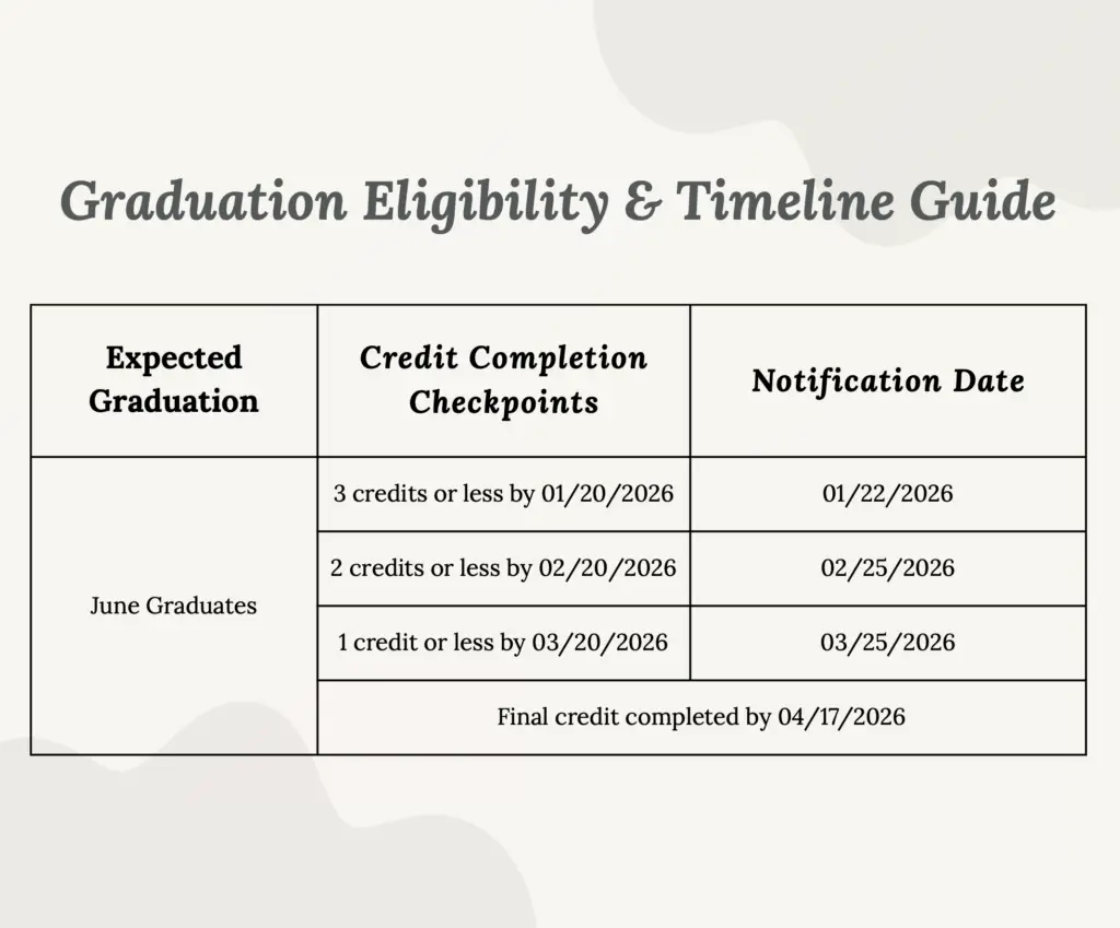 The guide below highlights the critical credit checkpoints and deadlines you’ll need to meet to be eligible for graduation this school year. Please take a moment to review it carefully, and don’t hesitate to reach out to Student Services with any questions about your progress.